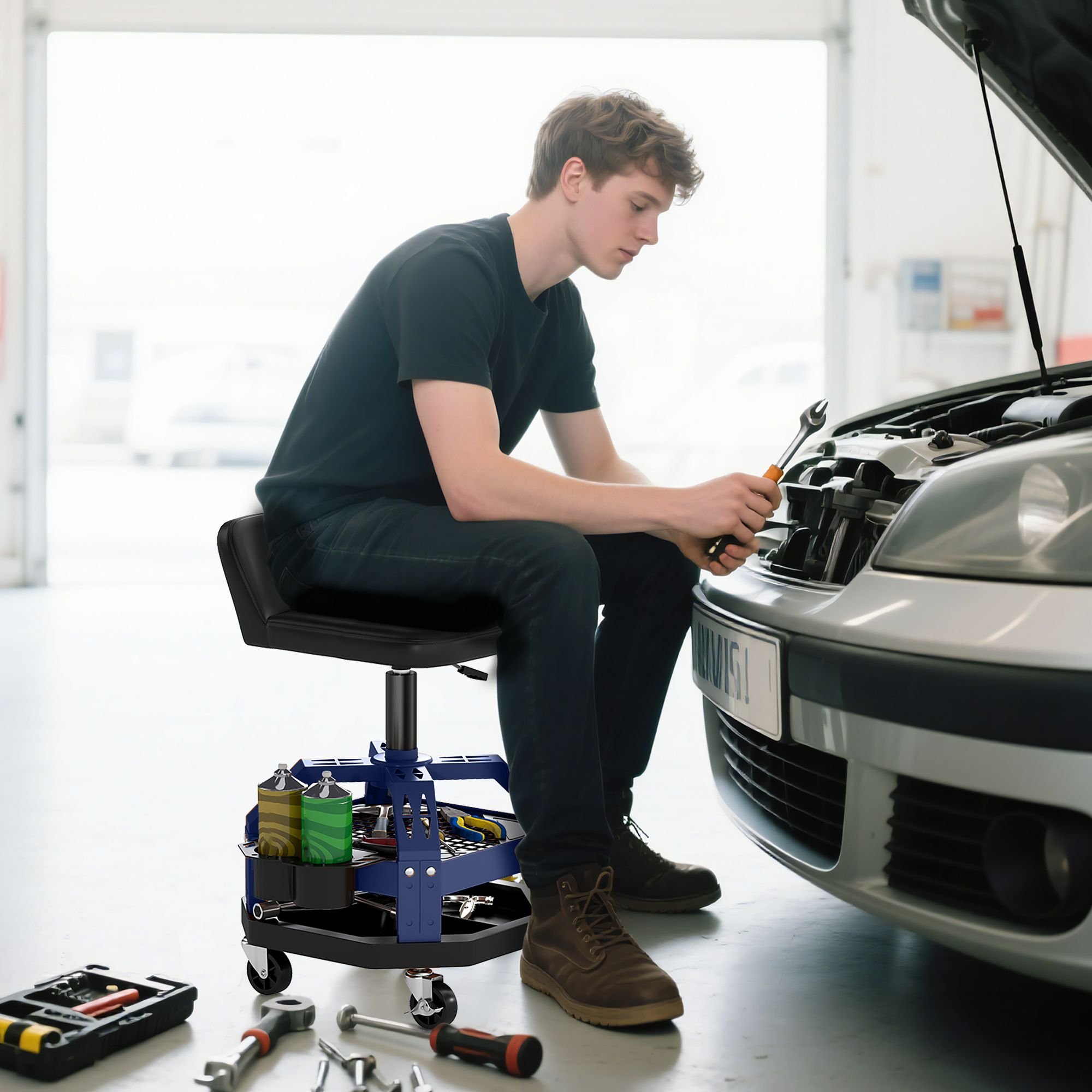 2.- 2-Tier Storage Tray with Bottle Holder: This garage chair features a dual-tier storage tray with a removable side bottle holder, keeping everything you need within reach, such as wrenches, screwdrivers, lubricant spray, and more